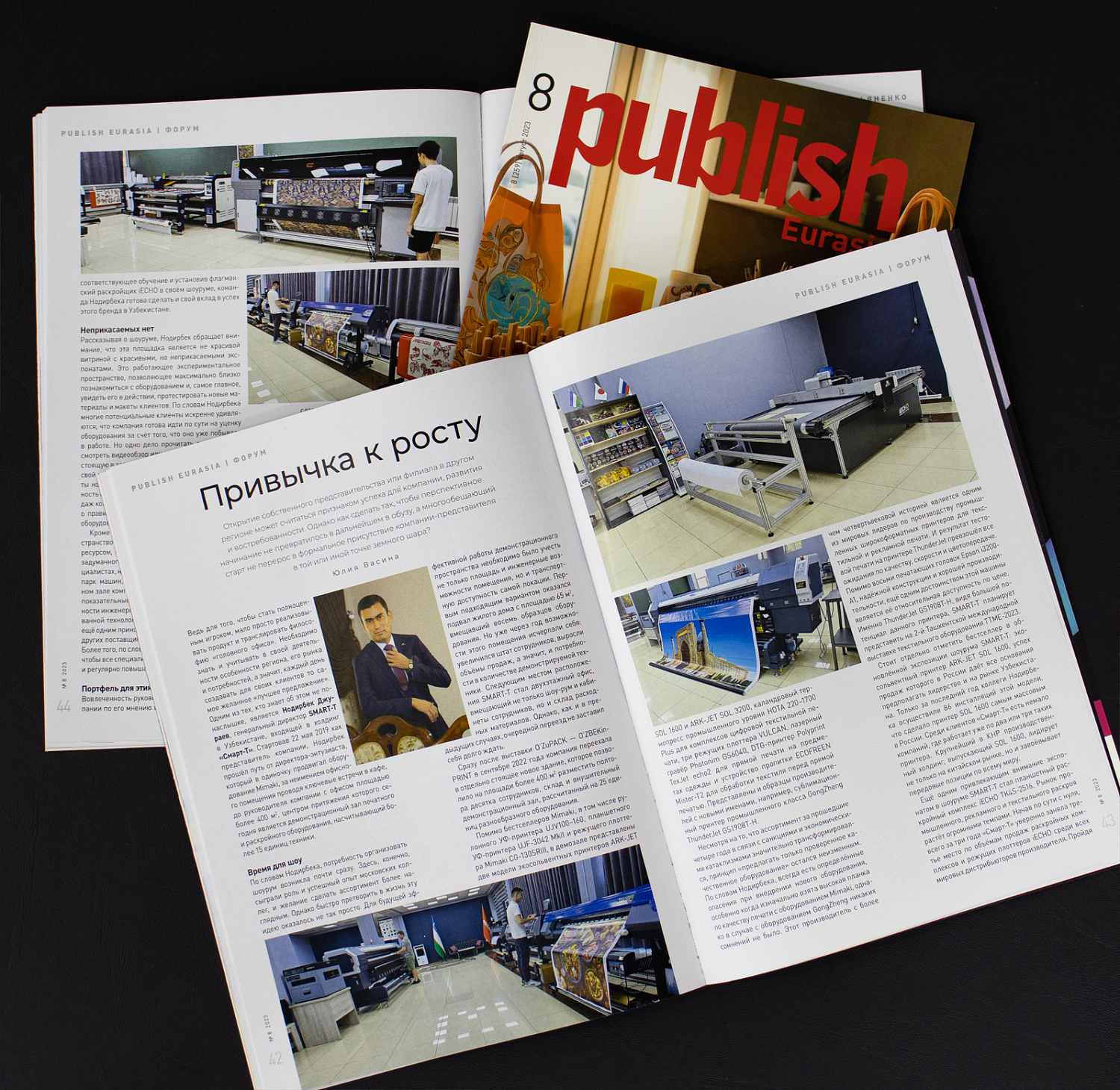 В свежем номере журнала Publish Eurasia, главного отраслевого издания для профессиональной полиграфической и рекламной аудитории Средней Азии, вышла интересная статья под названием "Привычка к росту". Она основана на интервью Нодирбека Джураева, директора компании SMART-T, крупнейшего и единственного в Узбекистане официального поставщика ведущих мировых производителей оборудования для цифровой печати и постпечатной обработки.