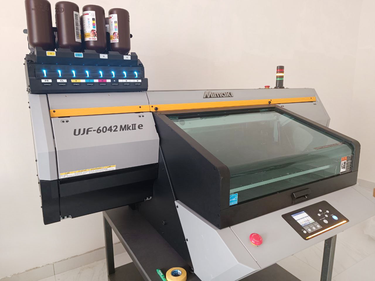 На днях наш инженер установил здесь новейший УФ-планшетник Mimaki UJF-6042 MkII. Этот высокотехнологичный принтер с белыми чернилами, лаком и праймером будет изготавливать эксклюзивные сувениры, подарочную и авторскую упаковку, малотиражную полиграфическую продукцию премиального класса (рельеф, выборочное лакирование).