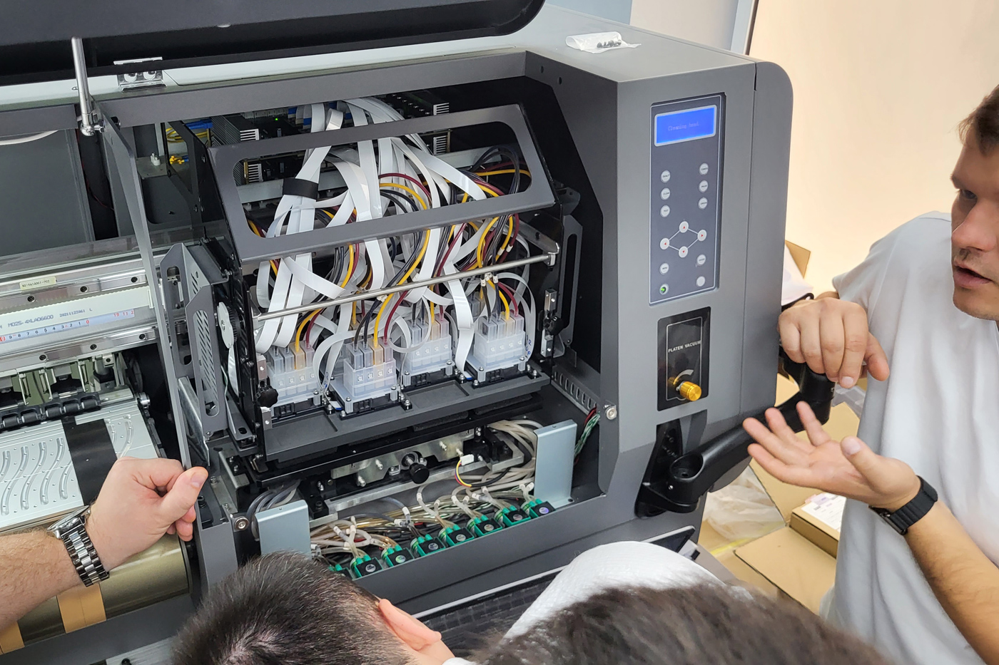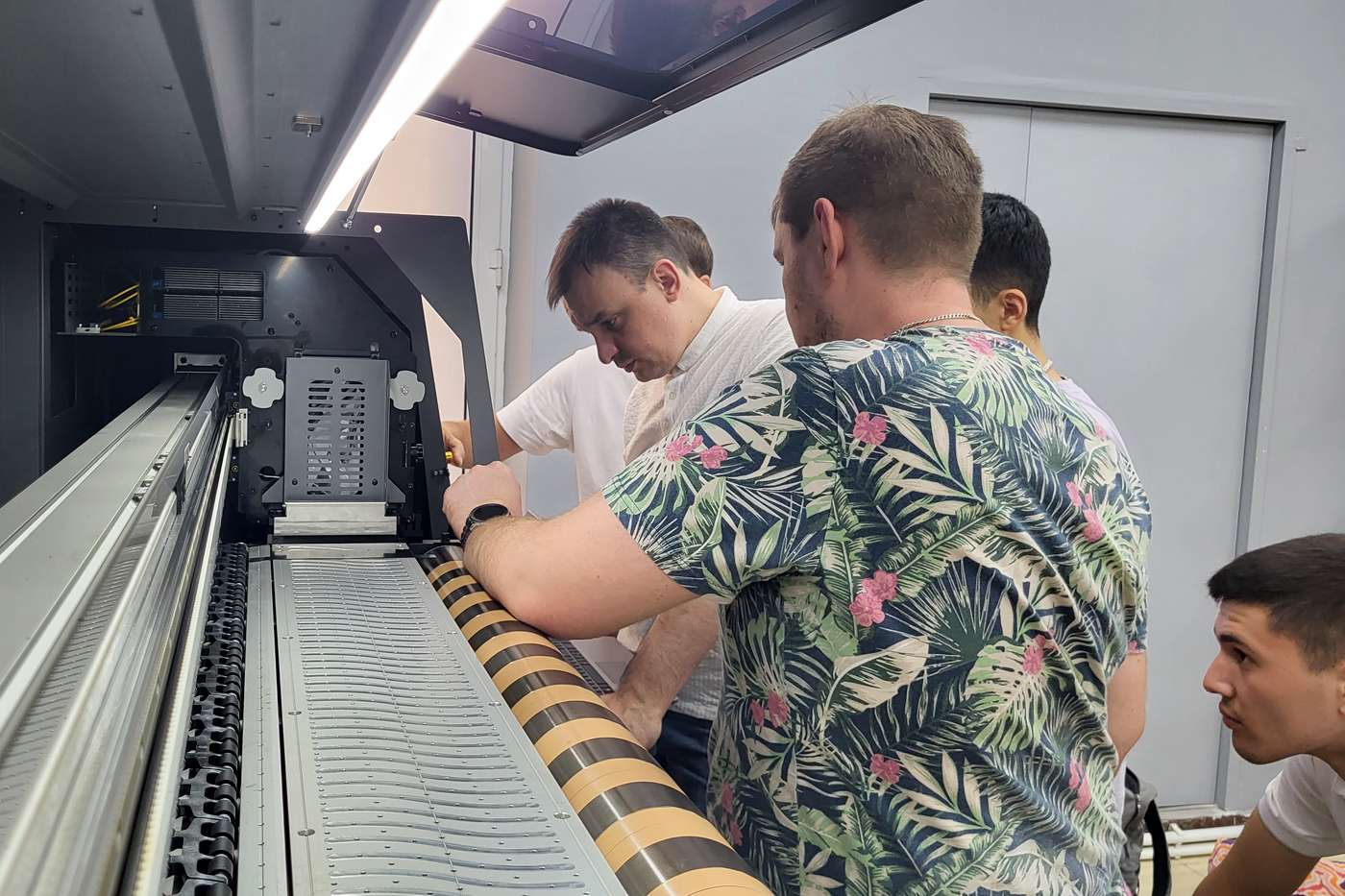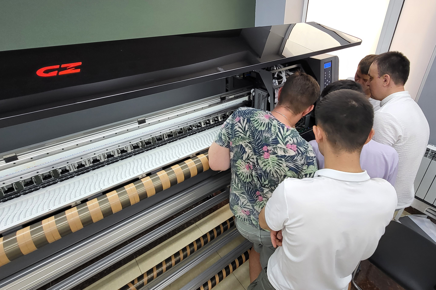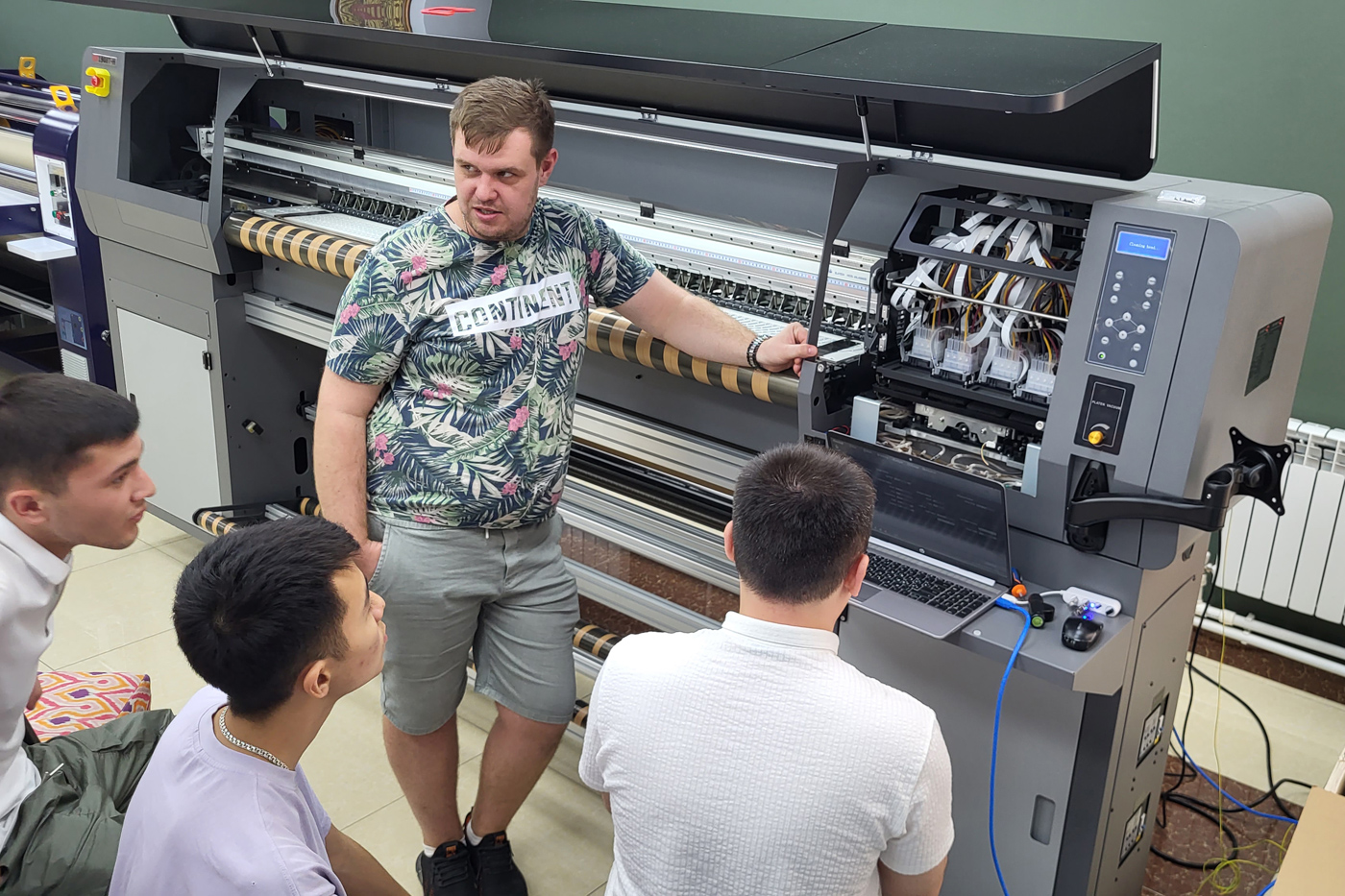Также каждые пару месяцев к нам в Узбекистан приезжает специалист из Москвы для обучения, передачи опыта и помощи нашим сотрудникам на крупных ответственных инсталляциях. Так, сегодня в нашем шоуруме один из ведущих технических специалистов московского офиса проводит обучение наших парней по работе и сервисному обслуживанию промышленного текстильного принтера Gongzheng ThunderJet GS1908T-H.