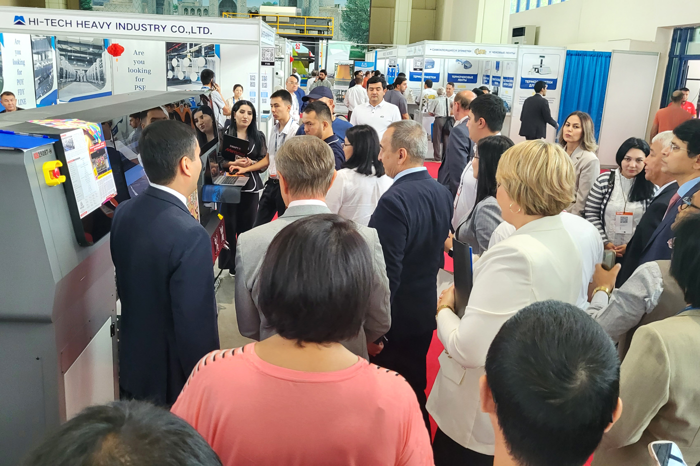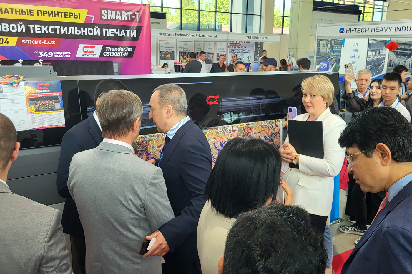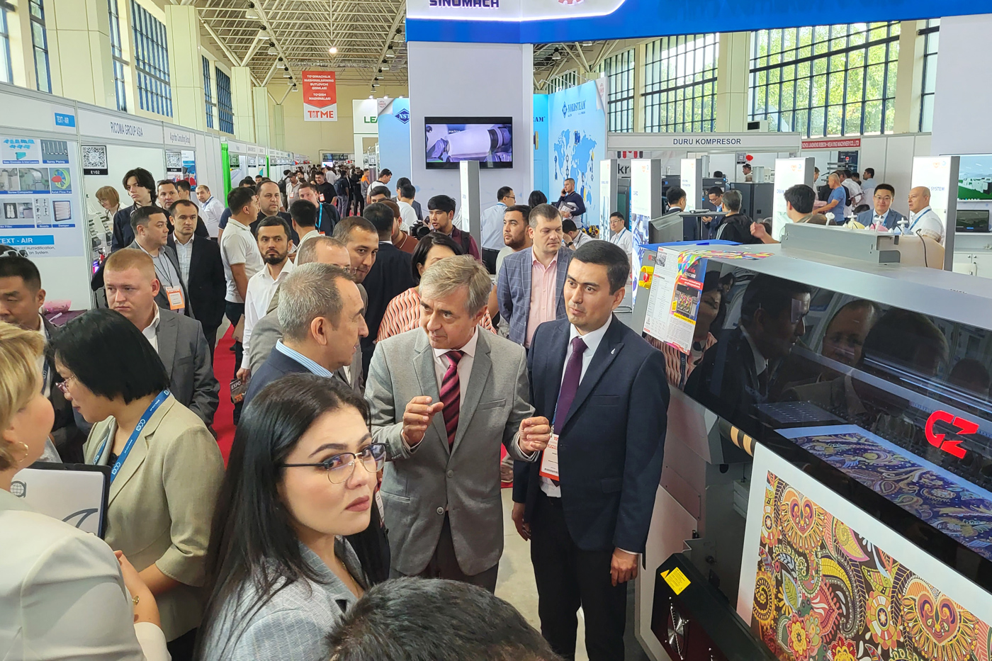Президент группы компаний "Смарт-Т" Андрей Макачёв, председатель Ассоциации “Узтекстильпром” Илхом Хайдаров и директор компании SMART-T (Узбекистан) Нодирбек Джураев возле сублимационного принтера GongZheng ThunderJet обсуждают активно развивающийся рынок цифровой текстильной печати Республики на полях Международной выставки текстильного оборудования TTME-2023, проходящей в эти дни в Ташкенте.